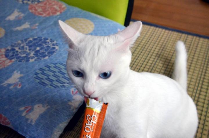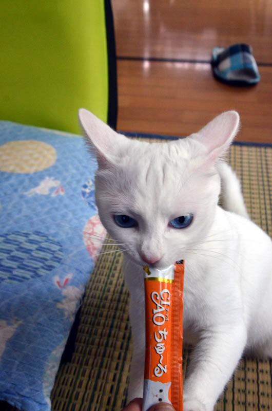 ちゅ~る以外のおやつの時は普通の耳ですが、ちゅ~るだけはイカ耳なのです。不思議です・・