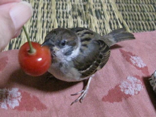 最近まで、あごが外れそうなほど口を大きくあけて、手をパタパタさせて食べ物をねだっていたのに、最近はさくらんぼを突いて食べるようになりました。
