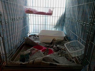 元気すぎて、ケージに戻して朝になるとこんな事になっています。
