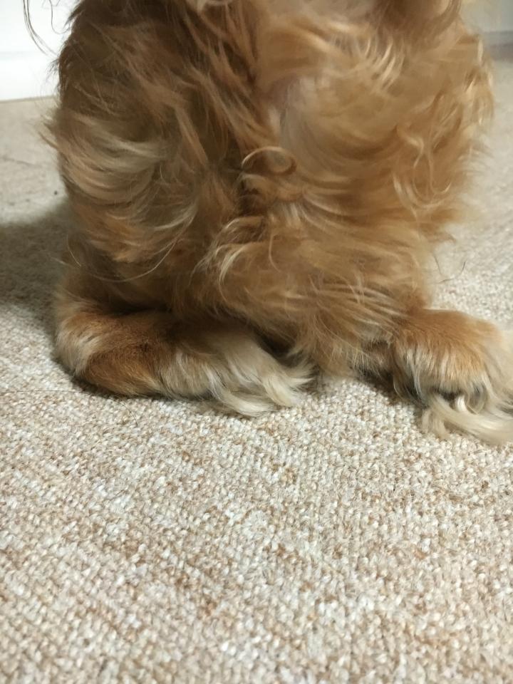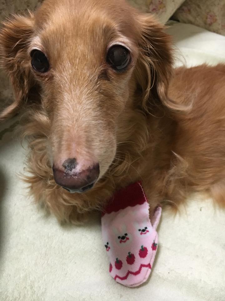 ショコラの脚は人間でいう手首の所から90度に曲がっている為、市販の犬の靴下が履けません。