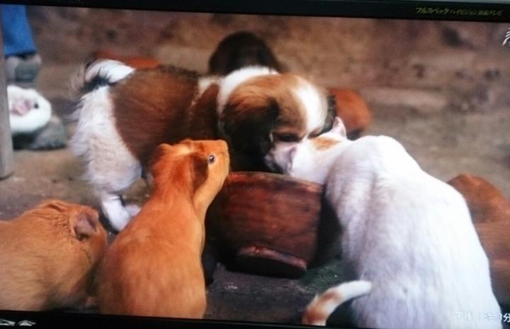 モルモット、子犬、猫、一緒にカリカリ食べてます!