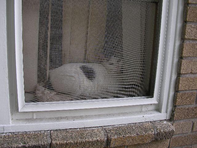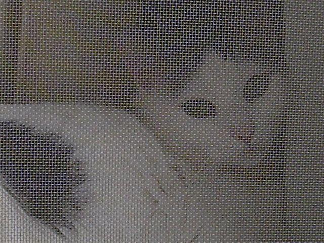 で、これだと網戸がモワレっててよく見えないから、縮小せずトリミング+圧縮したのも添えることにしました。これだと網戸の向こうからアンニュイな猫特有の眼差しでこっちを見ているのがよくわかります。