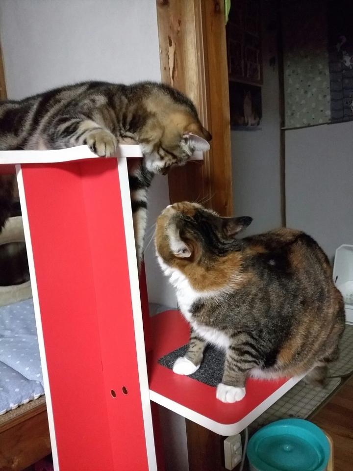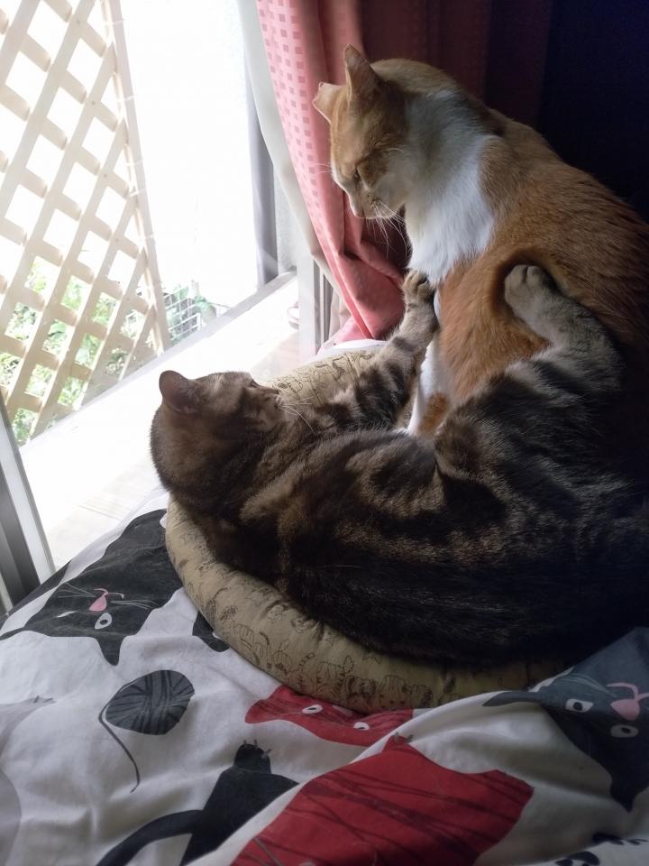 取っ組み合い、追っかけっことドタバタ遊びに精を出すニャンズ。