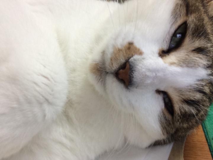 右の鼻の穴から大きな鼻くそがヒラヒラ出ていて
