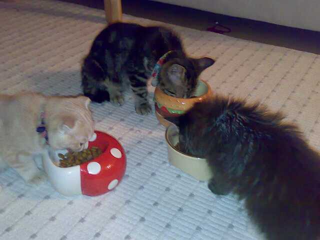 家に着くなり自分と同い年ぐらいの三ヶ月のニコに飛びついて遊び出したので安心しました。仔猫はほんと無邪気ですね。今は四匹ともグースカピーで寝ていますが6時15分になるとみんな起き出してきてごはんを催促するんです。猫の腹時計は凄い!