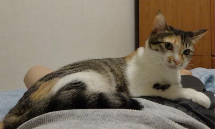 と思っていたら、憐れに思ったのか、明け方、三毛がお腹の上に。