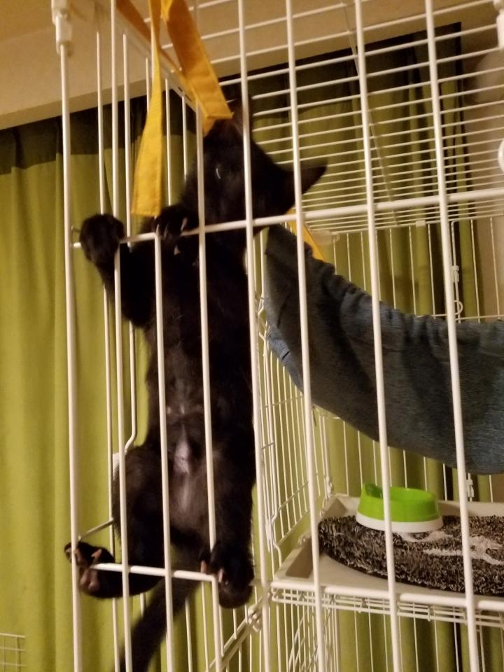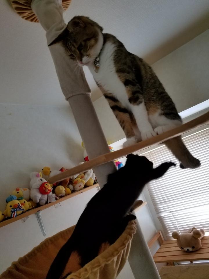 キャットタワーの4段目に、近くの棚から跳び移ることを覚えました。