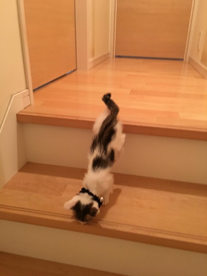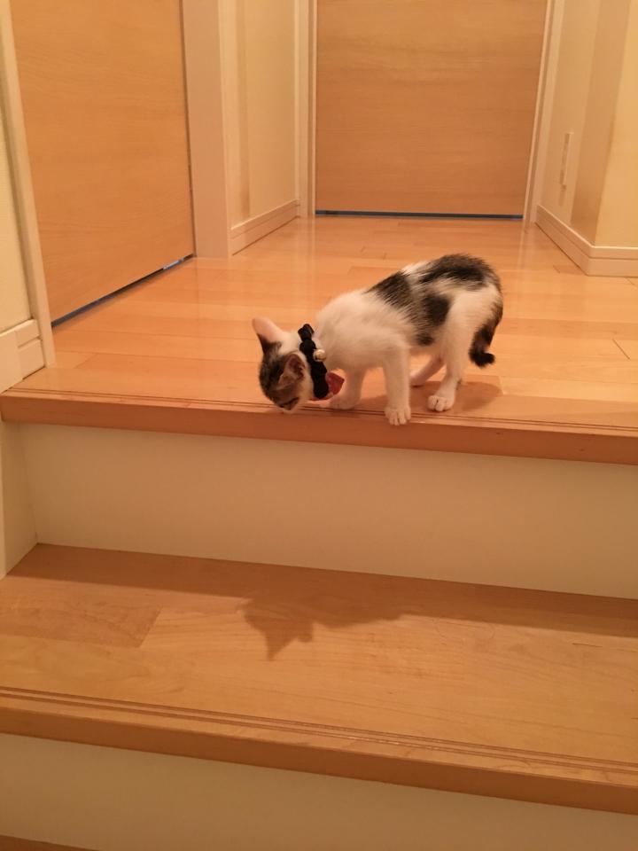 少しづつ慣れてきたので、階段上り下りの練習ですが活発で勇気ある子なので、最初は戸惑っていましたが、すぐに階段上り下りクリアーです!最初は様子見
