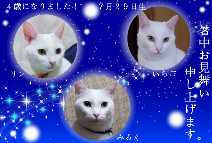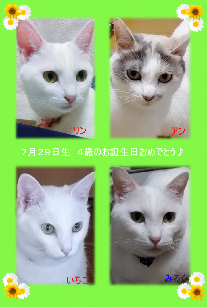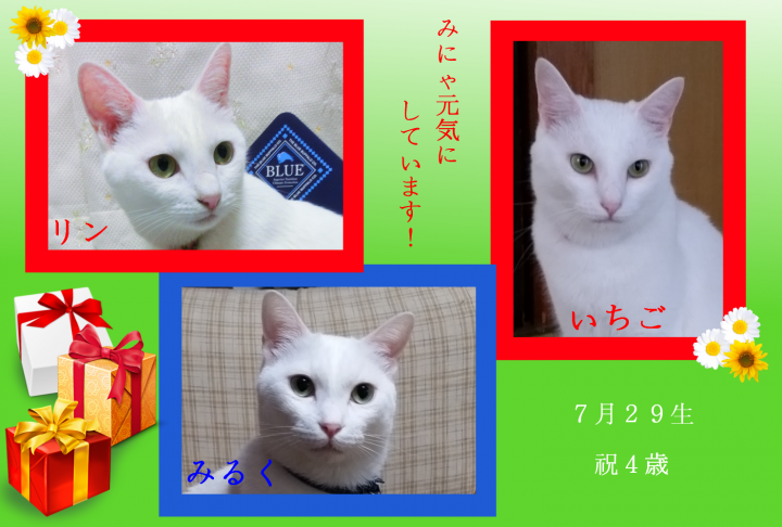 アンも加わった4にゃんのお誕生日カードです。妹にはデータを送ります。