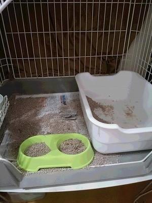 朝、沢山遊ばせた後ケージ内でカリカリを食べて