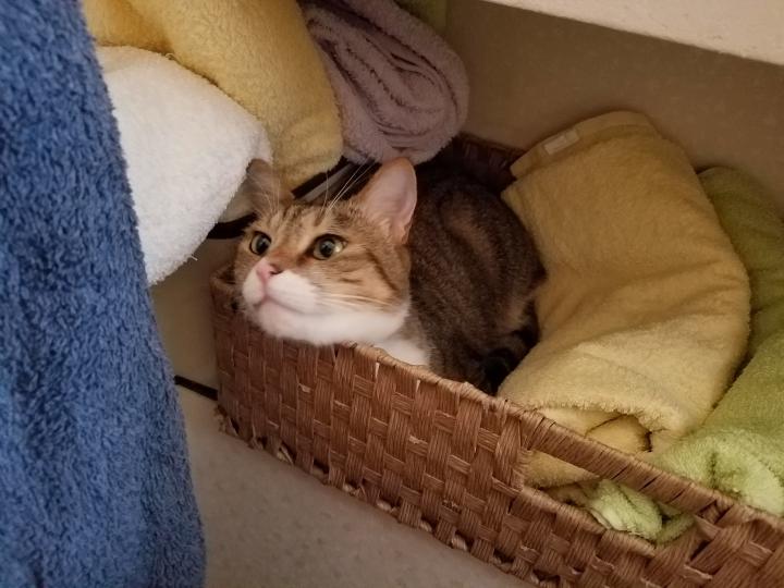 ワタシと一緒にお風呂に入ったサクちゃんは、出てきたらバスタオルと同化してました。