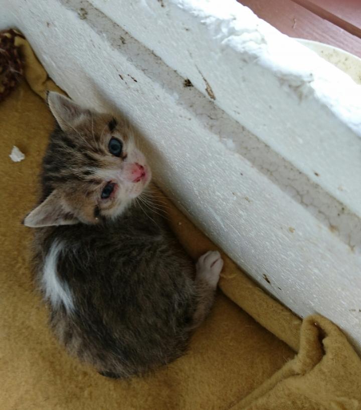 保護した頃(生後23日頃)のしらたま。片目がふさがって大変だったね。