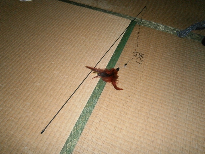 これ、もの凄い食いつきでした♪真上への大ジャンプを生で見て感激!!(笑)猫ちゃんて羽系の物が好物なのかな?? そのうち羽が全部なくなりそうなので、近々予備を購入確定!