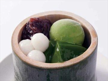 アンコと抹茶アイス、生茶ゼリーと寒天とバニラアイスが入っています