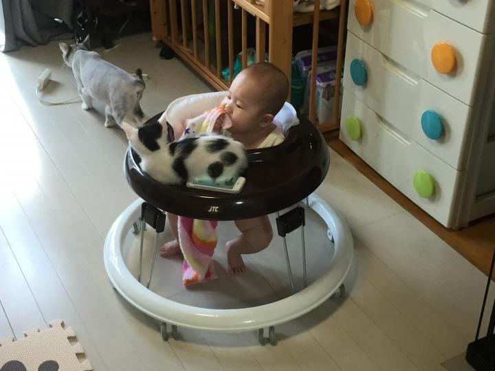 サウロが歩行器の上で箱座りしてました😂