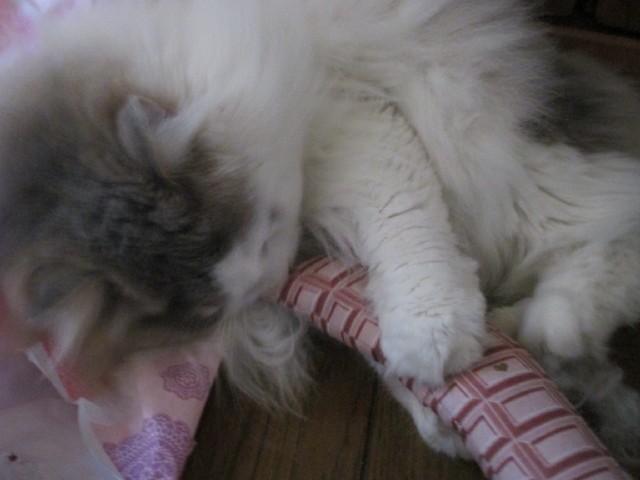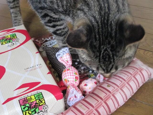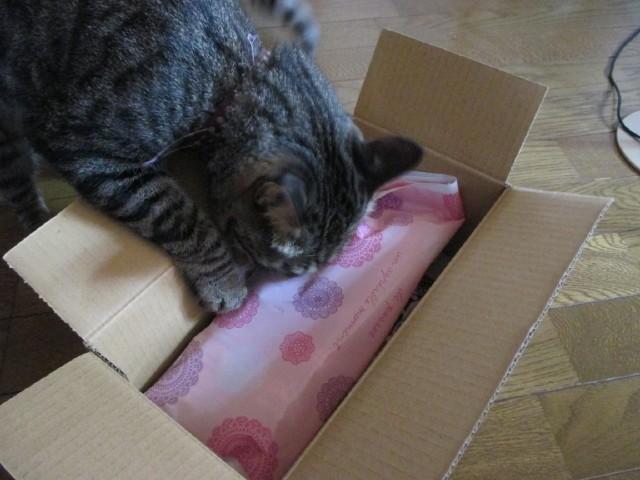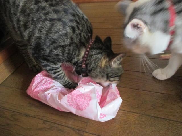ママ~、この包みは怪しいニャー。僕が調べるニャ~よ。