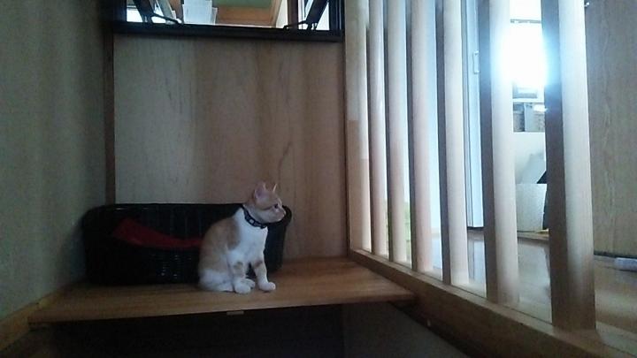 古い家なので階段が無駄に吹き抜けだったりする。空間が勿体ないから板を渡して猫達の秘密基地に。2階廊下の柵から出入出来るし、すぐ上にある窓からは風が吹いて涼しい。人も通らないしね。まだモチしか寝てくれないけど(笑)