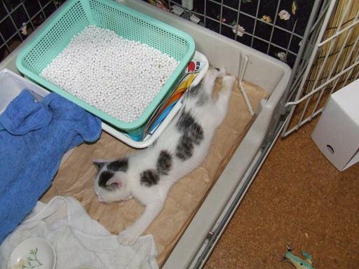 箱にタオル入れて、寝床用意、ケージに入れる。