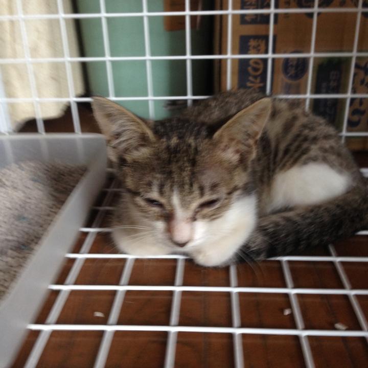 2週間位前から、餌やりさんには、風邪をひいてる子猫を病院につれて行きたいので捕まえられたら連絡をくださいとお願いしていたのですが、なかなか捕まらず、今朝の犬の散歩中に偶然捕まえられて、そっと抱き抱えて連れて帰りました。