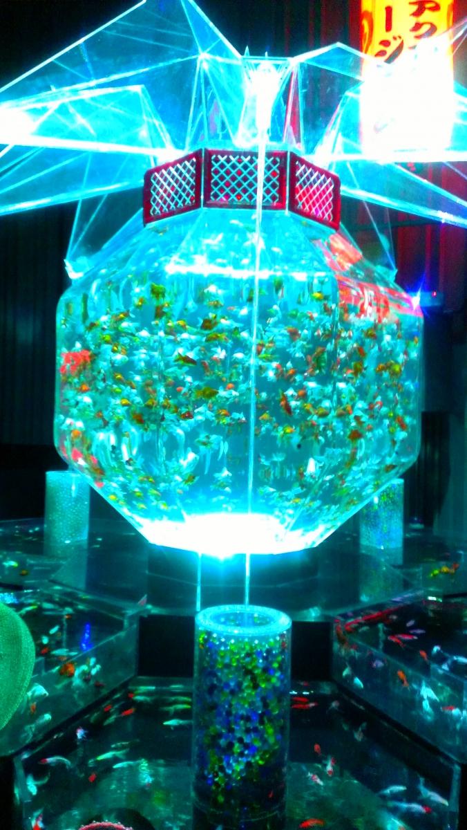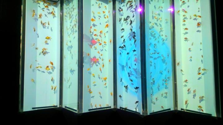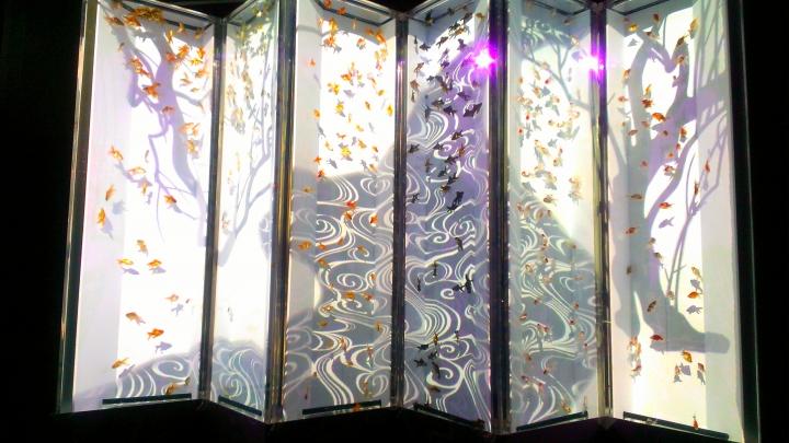 屏風水槽。プロジェクションマッピングと金魚のコラボレーション。ここが一番人だかりだった…。でも、一番お気に入り。(*^^*)