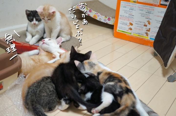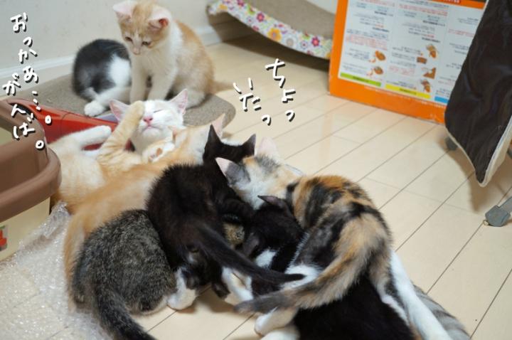 子猫たちはどーぞお構いなくといった塩梅で隙をついて群がっている感があります。