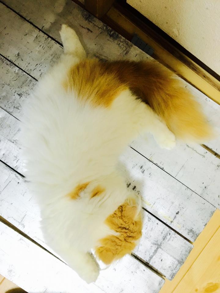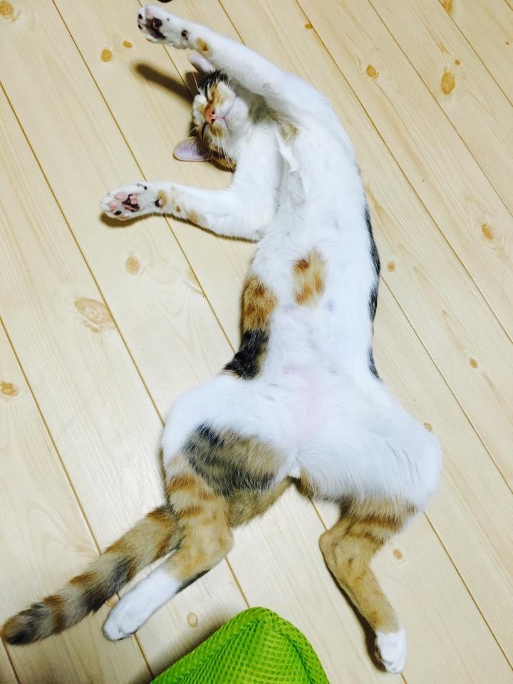 モコさんはパパりんの仕事道具の上で変な寝方。
