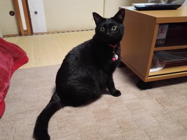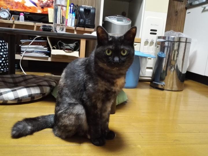 性格は控えめで、お腹が空いても鳴かず、皆が食べている時に後ろの方で控えて順番を待っていたり、ちょこんと台所に座っていたりします。