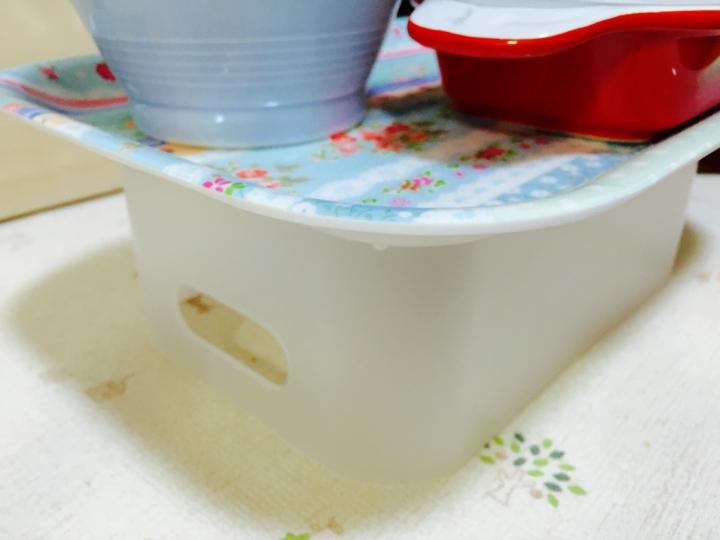 収納ケースを幅広なものを選べば安定感もありますし、トレイの下にこぼしたカリカリや埃が入り込みません。