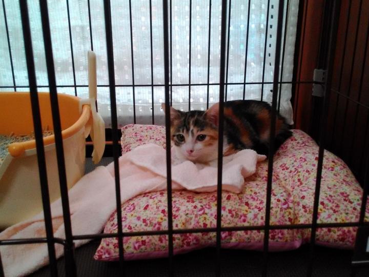 ・ケージに入れると数分は出してほしいと鳴きますが、それ以降はあきらめておとなしく座ったり寝たりしま す。