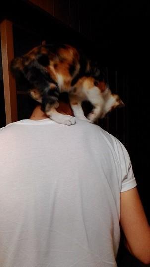 てまりのゴハンの用意してくれてるおにいさんの肩に乗ってるところ。てまりは肩乗り猫なの。