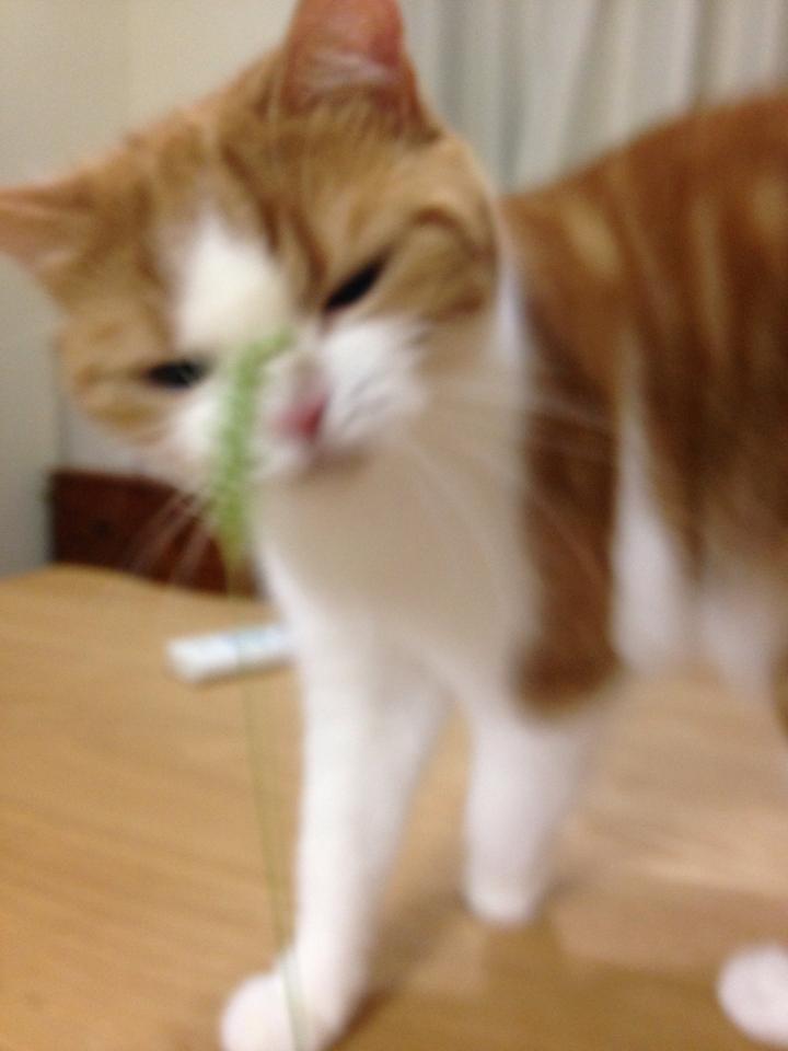 おかえりトトちゃん。ぽんちゃんにお土産?。こちょこちょ♫猫じゃらしだね!