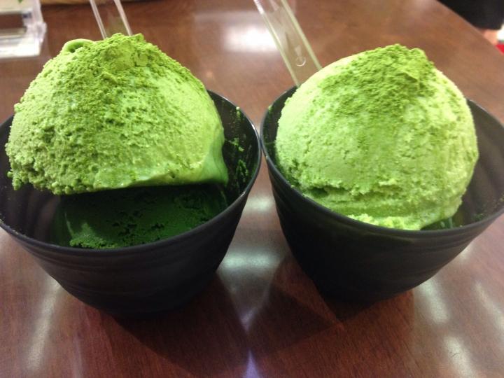 ☆今日は夫婦で暑気払い。日本橋の三越で期間限定の抹茶のジェラートを販売してるので行ってきた。7種類の抹茶の濃さから選べるので、私は1番濃い7番と中間の4番にした。甘くなくて美味しかった〜♫。