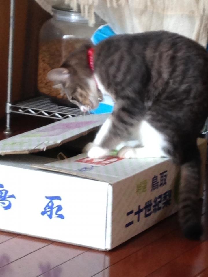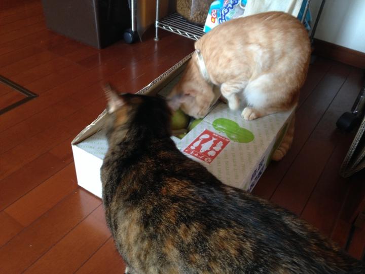ハンちゃん、もぐりこんで梨を舐めてます(笑)