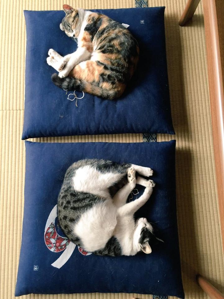 お盆の時、敢えてお客さま用の座布団に寝る みーこ氏と かりん氏。コロコロ掃除するのは私ですよ。
