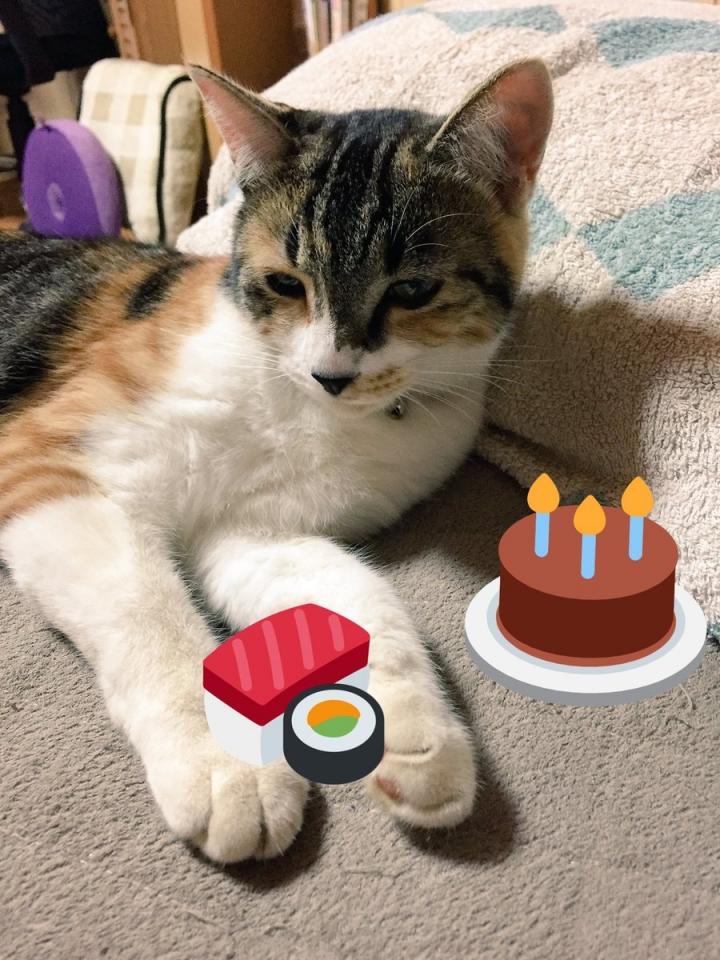 8月29日はカリンちゅわんの1歳お誕生日でしたぜ!!しーすーときーけーを贈呈(スタンプで。)リアルにはちゅーるシーバ添えをプレゼンツ!