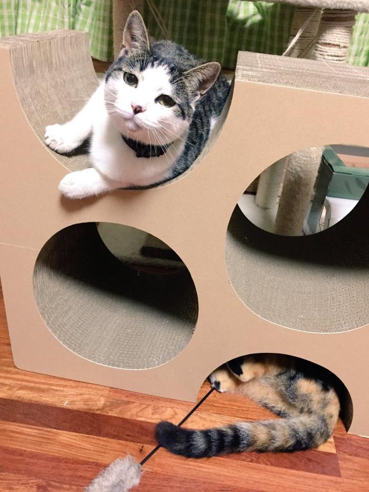 くらふと工房さんの爪研ぎを購入。密林レビューで良い評価だったのでぽちってしまいました。(4000円弱したけど…)買ったのを知らなかった家族が届いた段ボールに「クラフト工房チーズ」と書いてあって生ものだったらどうしよう…と焦ってましたw チーズはこの爪研ぎのかたちのことでしたへっへー!おもちゃで遊ぶ時にこの穴が身を潜めたり出来ていい感じ♪ただ分かっていたのだけれど段ボール爪研ぎはカスが出ますよね…うーん、わかって買ったんだけどね。