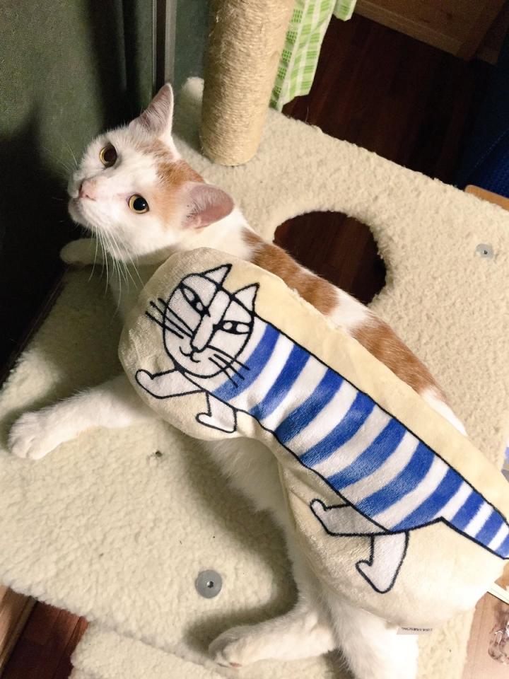 ねこのきもちの付録。クッションなのに綿すくなっ!www ですがゆーさんが枕にしたりふみふみしたりめっちゃくちゃ気に入ってくれたよう。猫にはこのくらいの綿加減が良いのかな?