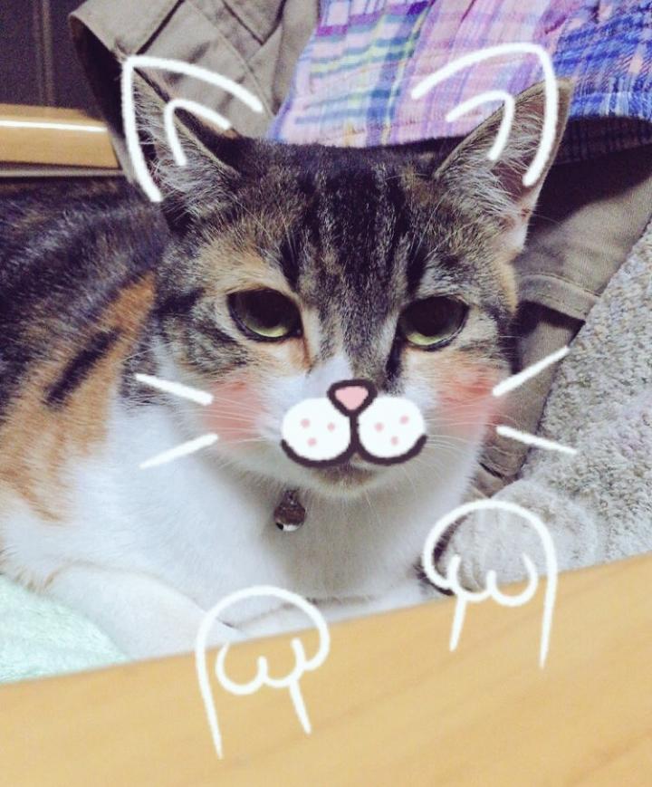 若いおなごが使っているアプリ、スノウでカリンちゃまを撮ってみた。昨日、年下の友人に教えてもらって爆笑。これは面白いですわ〜〜。人間に使うものですけど、猫ちゃんを撮ってみても十分面白いですね。今度は二匹並んでいる時に顔交換してみよう笑
