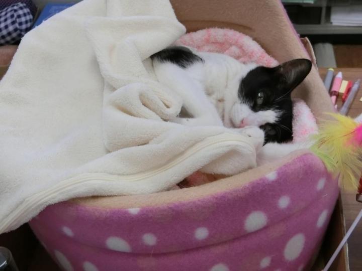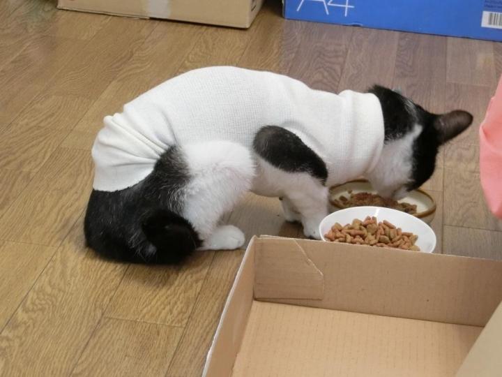 本日は術後から食べているa/d缶に、こまかくしたドライにお湯を入れてウエット状にしたものを加えてあげたところ、それも完食。ゆくゆくはドライをそのまま食べていけるようになればなと。