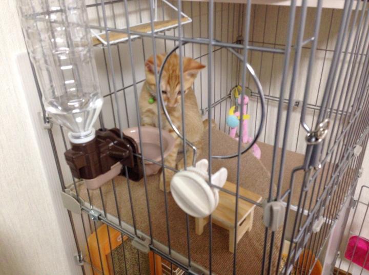 隣の輪っかは食べるときだけパタンと倒して使うエサ入れ。今回購入したものはお皿に突起が付いていて輪っかに固定できるタイプ。ひっくり返すことができません。以前使っていたものは上からはめ込んだだけのもので、何と下に頭を入れてひっくり返していました。