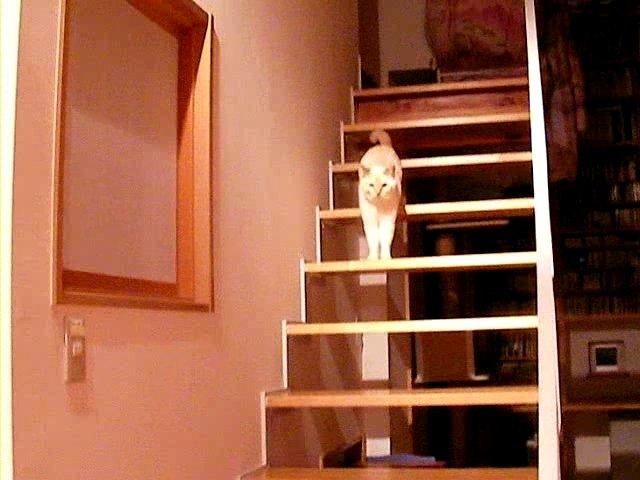 外からの訪問者はたいがい2階までは上がってこないことを経験的に知っている、とっても怖がりの彼女が、まさに訪問者をいつも見つめる、階段の小さな踊り場から3段下った正しいポジションに後ろ足をおき、しかし前足2本は1段踏み出して、そうして固まっています。