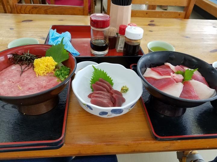 左からネギトロ丼、カツオの刺身、紅白丼(マグロ)です。