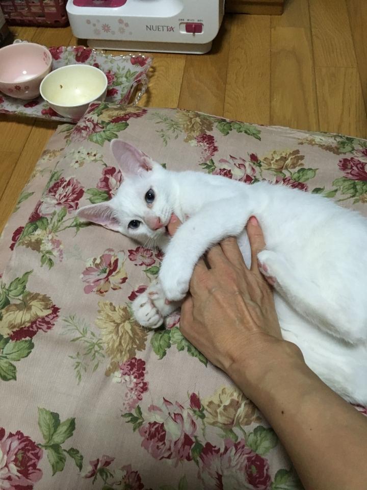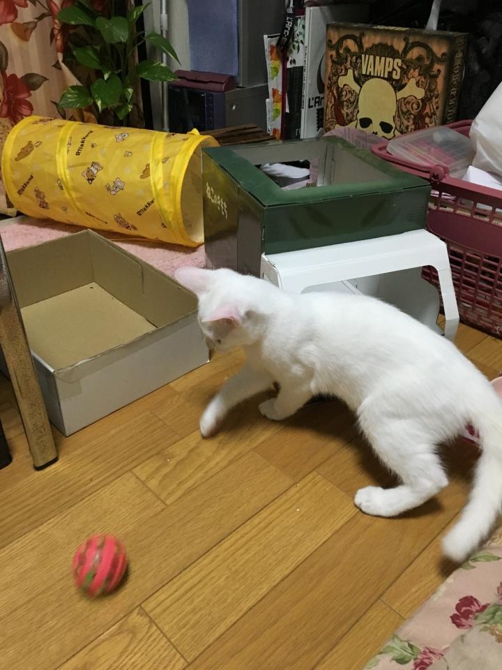 1日いたらもう懐いて、私がいなくなると鳴きます。今はおもちゃで一生懸命遊んでいます。すごく可愛いくて、賢い、いい子です。