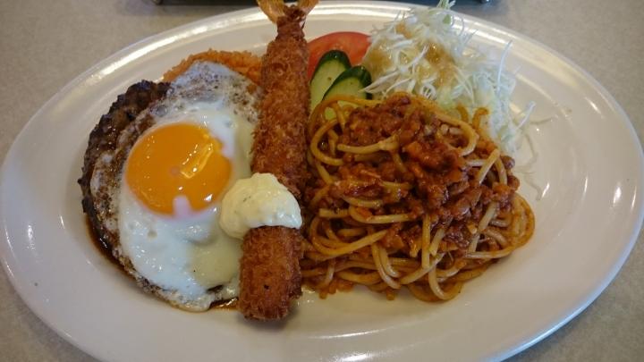 チキンライス、ハンバーグ、目玉焼き、海老フライそしてミートソースです。