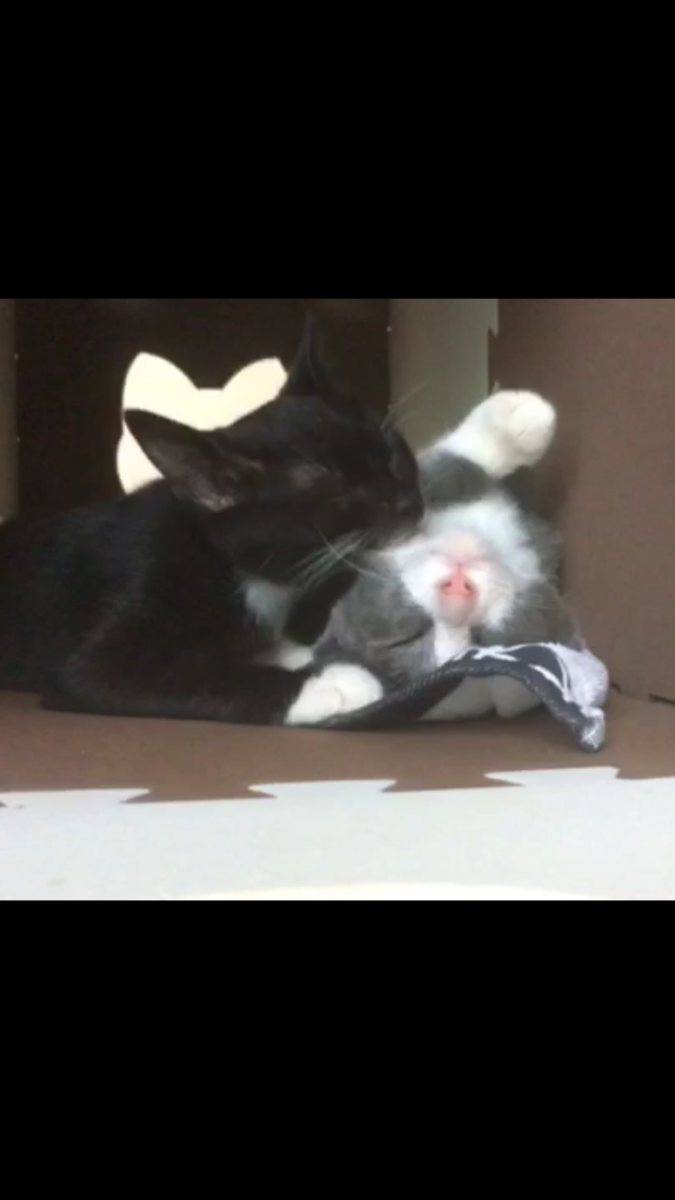 なぜか動画が貼れなくて、写真でしかお見せできませんが、ヘソ天のグレちゃんを黒ちゃんがグルーミングしてます🐱