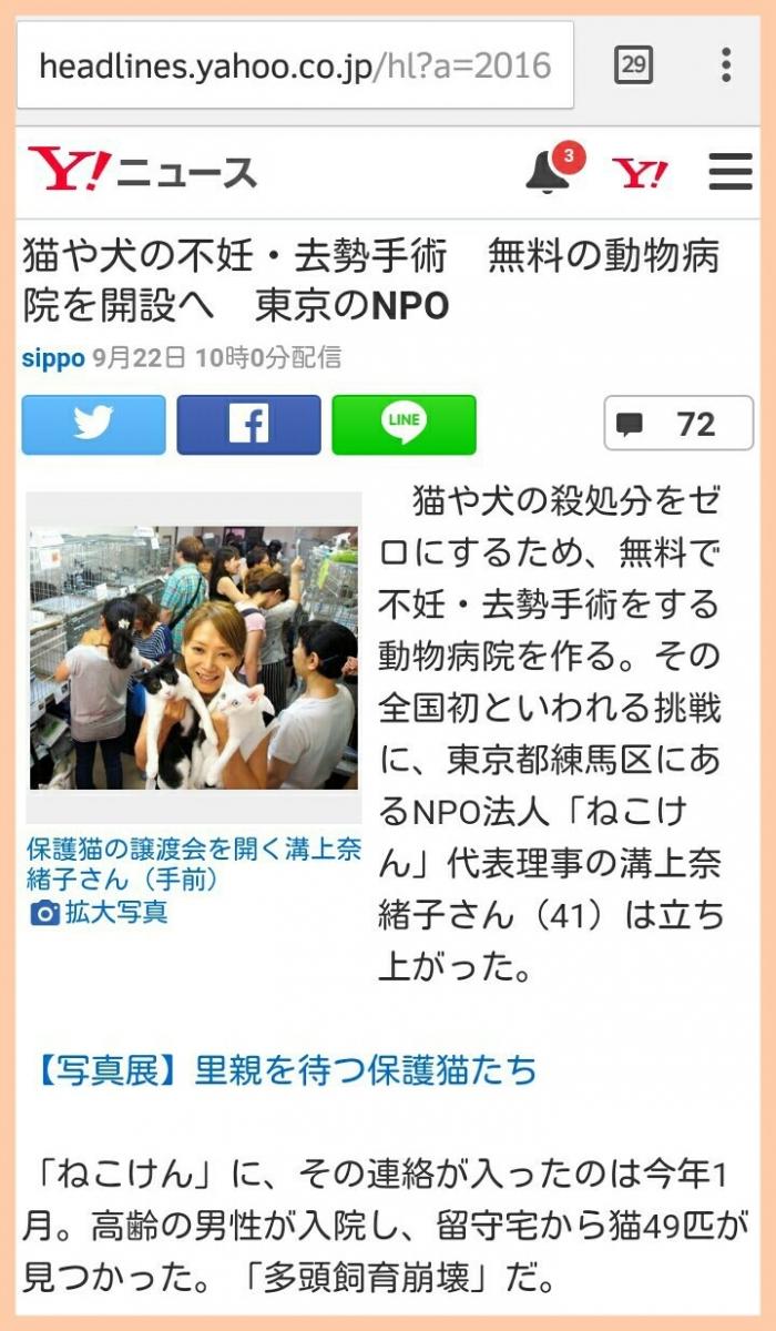 "猫や犬の殺処分をゼロにするため、無料で不妊・去勢手術をする動物病院を作る。その全国初といわれる挑戦に、東京都練馬区にあるNPO法人「ねこけん」代表理事の溝上奈緒子さん(41)は立ち上がった。"(一部、抜粋)