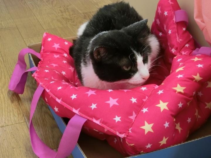 本日のサナエさんの様子(先日ベッドにおしっこしたので新調したら、小さかったので片側開放して使用)