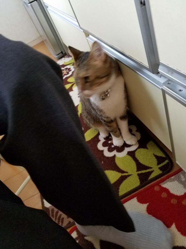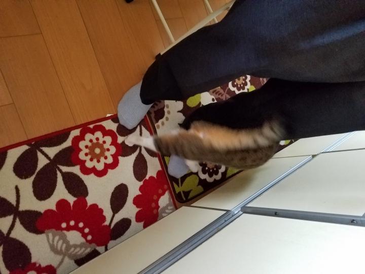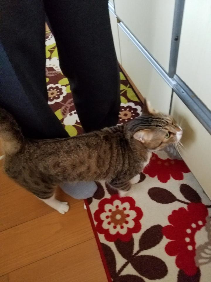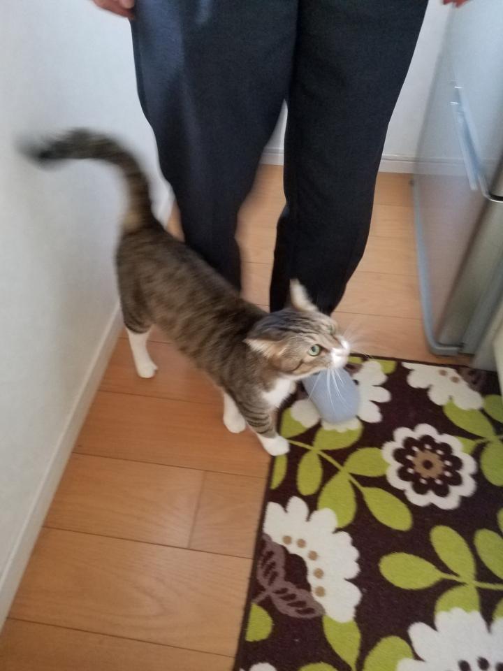 出勤前のおとさんに甘えて、まとわりつくサクちゃん🐱