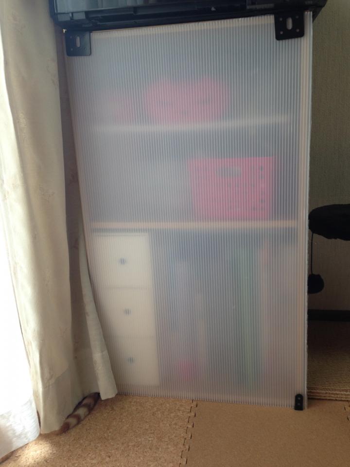 毎度お馴染みプラダンです。四隅にあるのはL字金具です。左にしおの尻尾も見えてますね。プラダンを横から差し込むだけ、金具は差し込んだだけで、ボックスの重みで固定されています。