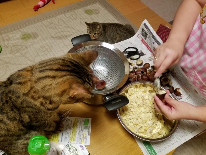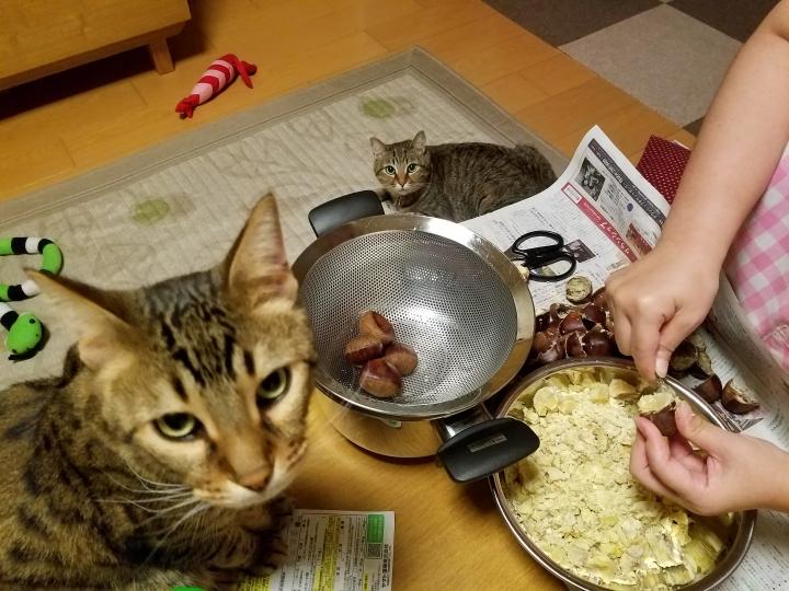 ニコちゃんは確実に栗を狙ってるけど、食べられるかどうか不安げ😸